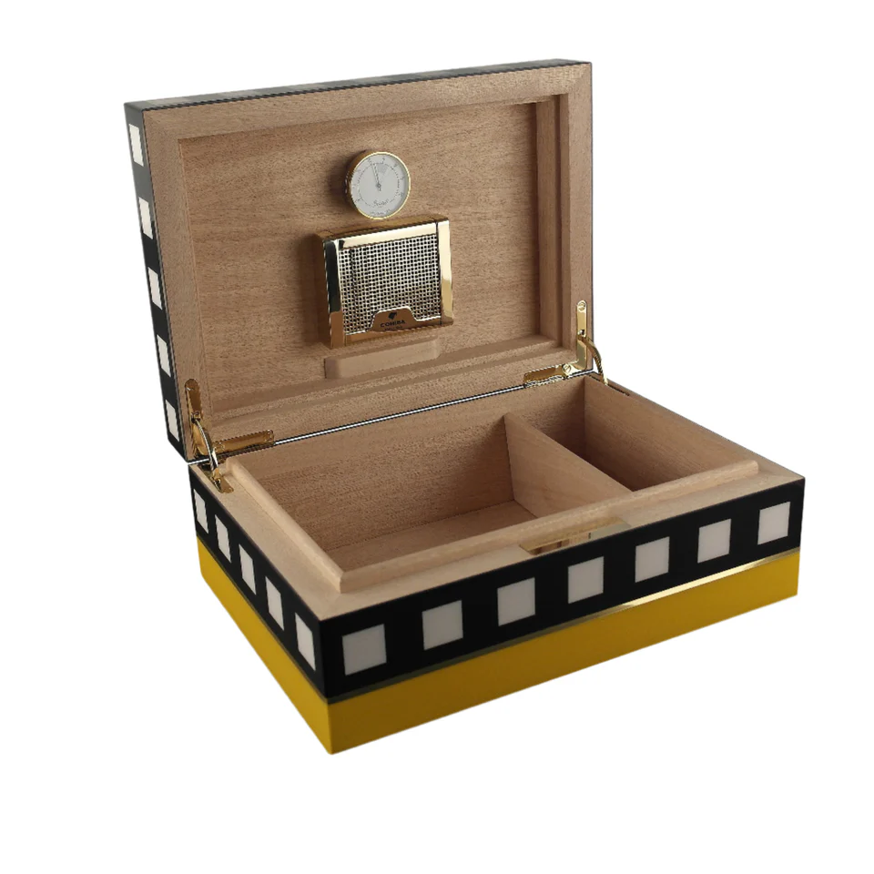 Treat yourself to the luxurious Cohiba Limited Edition 2021 Humidor, crafted with iconic black and white checkered patterns and yellow accents.