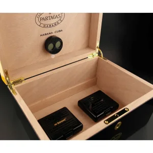 The Partagas Global Brand Humidor is the all-in-one solution to keep your Cuban Cigars fresh for years. It has a mat black wooden case, a red accent across the box, and the iconic Partagas logo adorning the top.